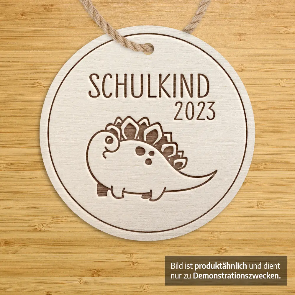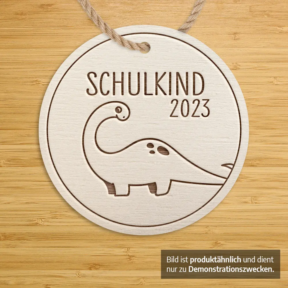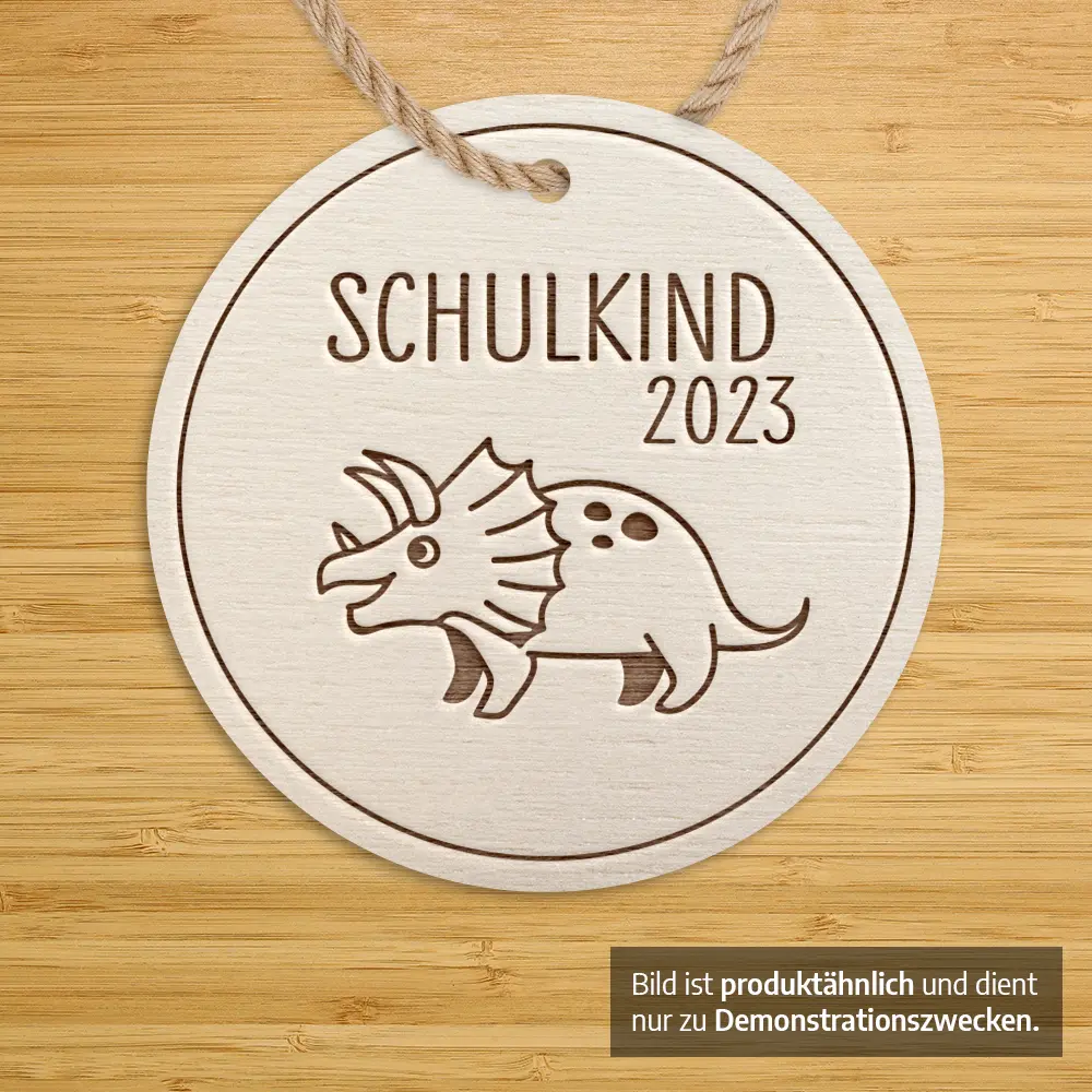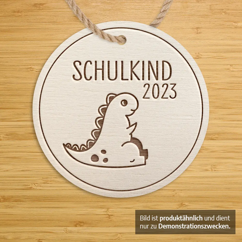Runde Anhänger aus Holz für Schulkinder zur Einschulung mit Dino Motiven und einer Auswahl von 4 verschiedenen Motiven und drei unterschiedlichen Größen.